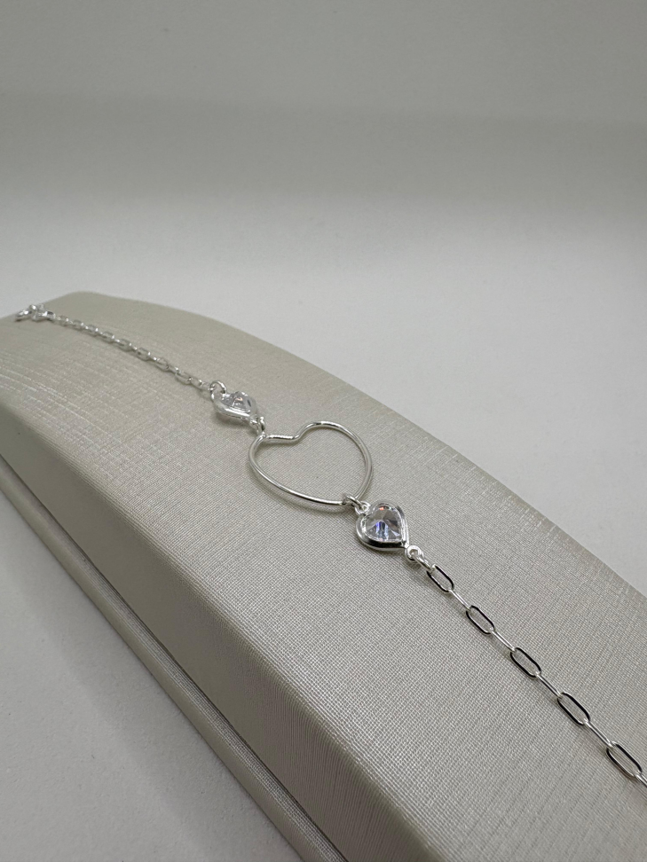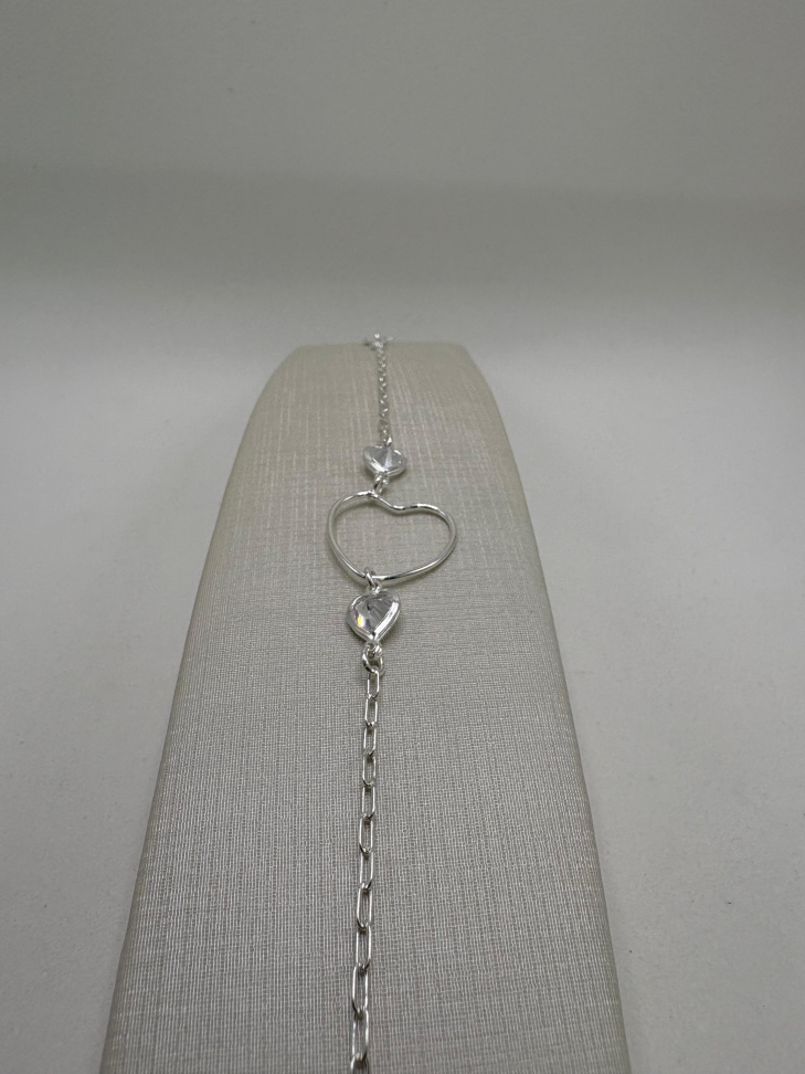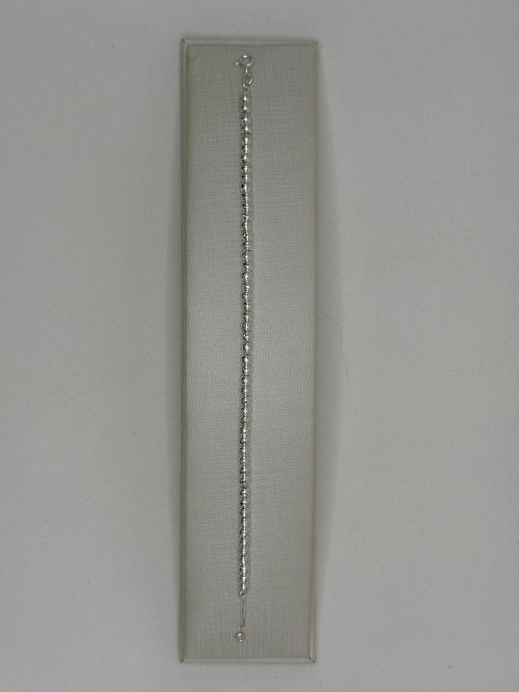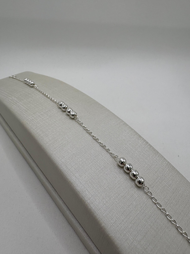 Pulseira prata elo português entrelaçados bolas lisas e zircônia redonda azul claro.